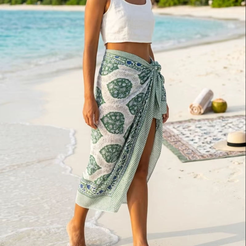 ผ้าซิ่นทำมือ 100% ผ้าฝ้าย พิมพ์ลายดอกไม้ด้วยมือ ทรงเอวธรรมชาติ ใช้คลุมชายหาด สไตล์โบโฮ กระโปรงพัน