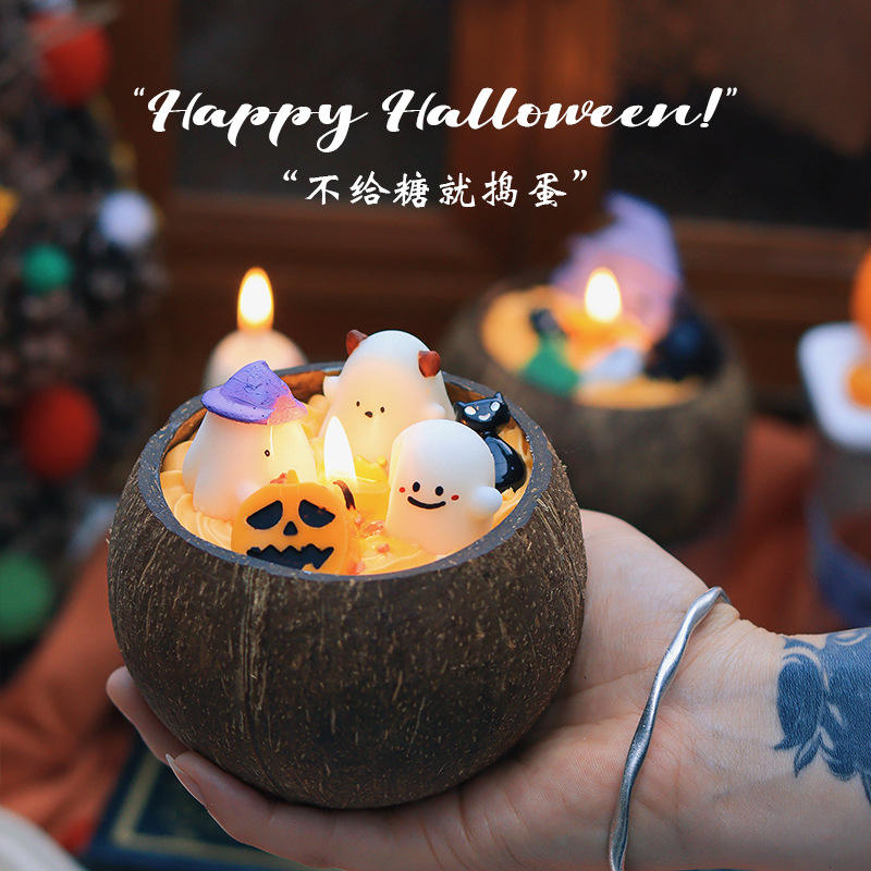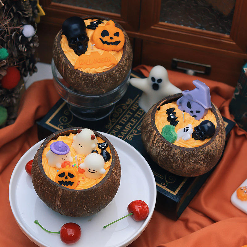 เทียนหอมทำมือจากขี้ผึ้งถั่วเหลืองออร์แกนิค 100% สำหรับฮาโลวีน สร้างบรรยากาศลึกลับ ดีไซน์ศิลปะสมัยใหม่ บรรจุในเปลือกมะพร้าว เหมาะสำหรับงานวันเกิดและโอกาสพิเศษต่างๆ