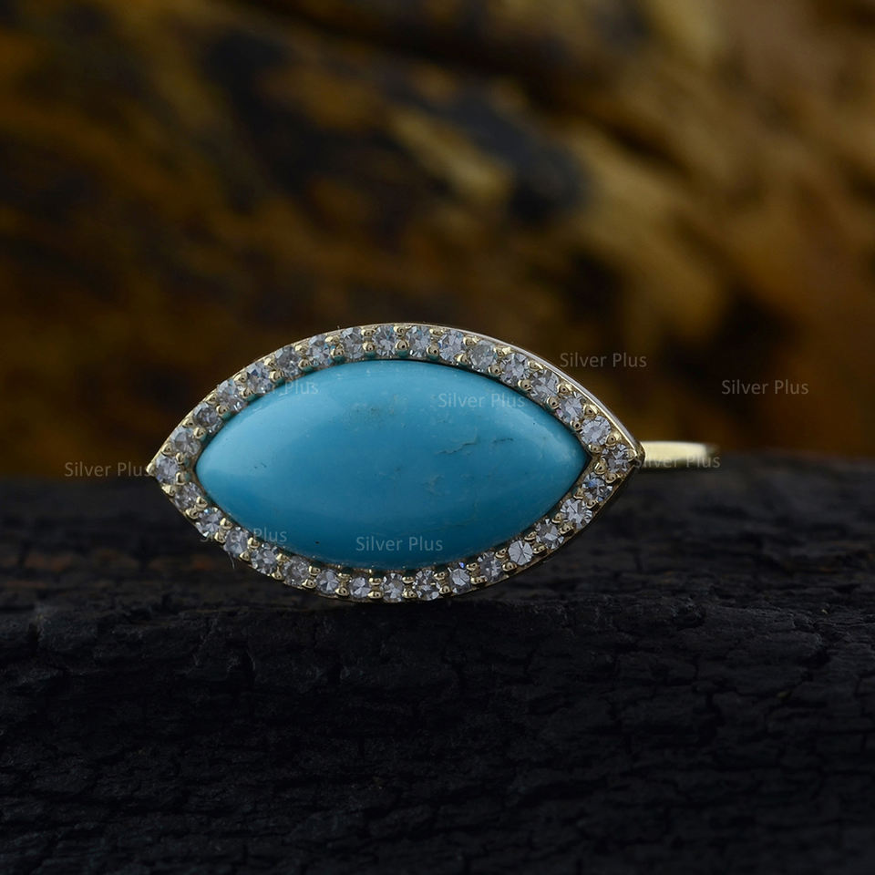 แหวนทอง14K ทำด้วยมือมาใหม่ของแท้มาร์คีโซนาพลอยเทอร์ควอยซ์เพชรอินเทรนด์สำหรับงานแต่งงานตัวเลือก10K/18K