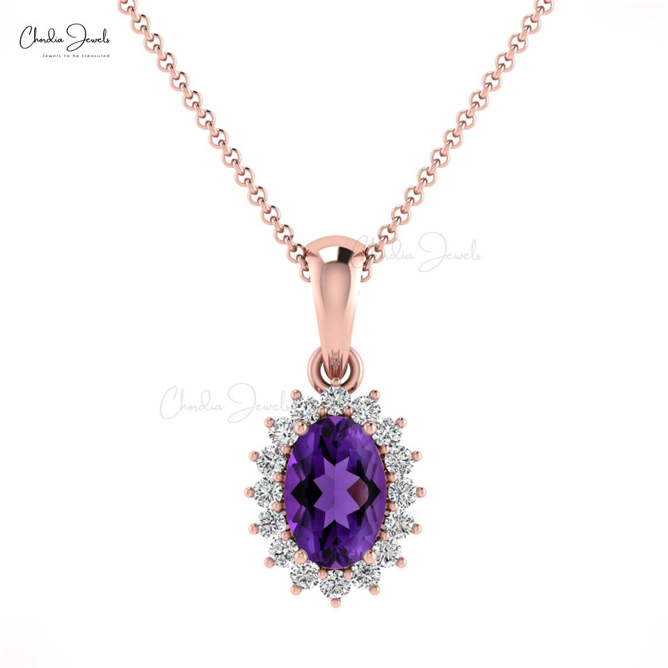 จี้ทองคำแท้ 14K ประดับด้วยอเมทิสต์แอฟริกันธรรมชาติ ดีไซน์เรียบหรู น้ำหนัก 0.11 กะรัต ฝังเพชรแบบ Pave Set ของขวัญสุดเพอร์เฟคสำหรับวันสตรี