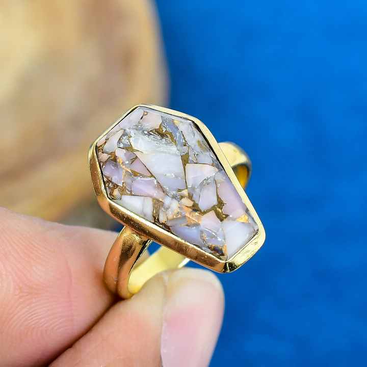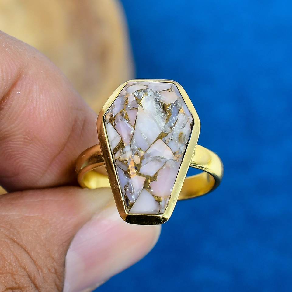 แหวนพลอยโอปอลสีชมพูรูปโลงศพทำมือ ชุบทอง 18k บนตัวเรือนเงินแท้ 925