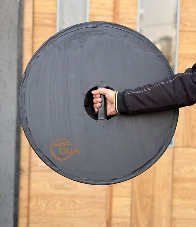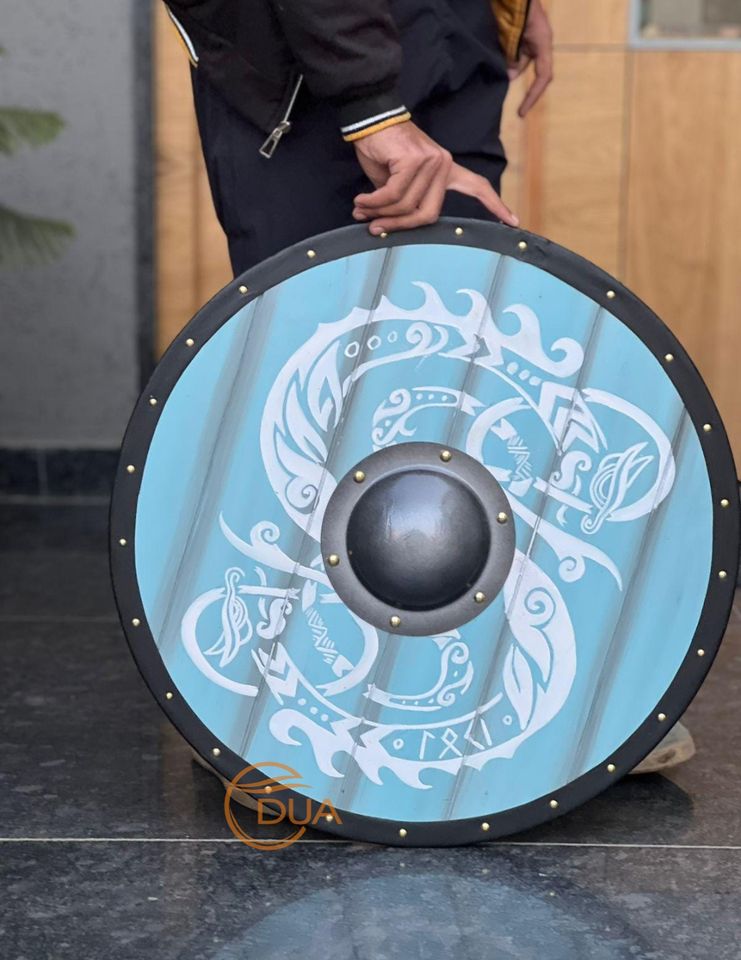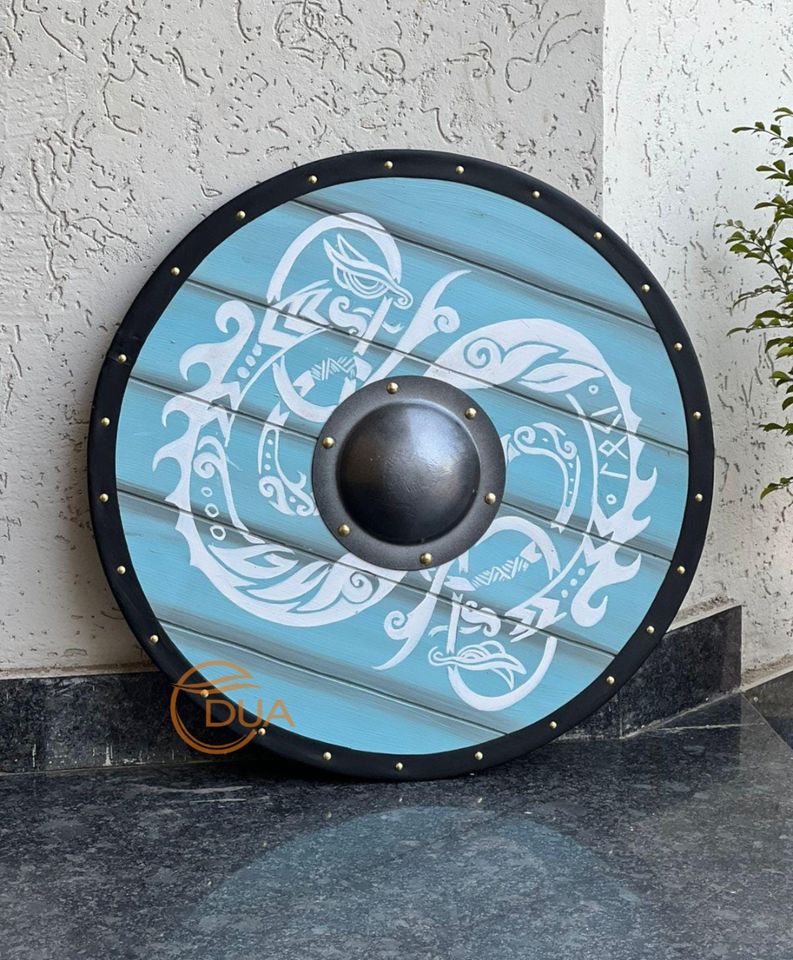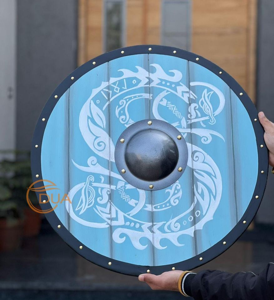 โล่ไวกิ้งยุคกลางทำมือขนาด 24 นิ้ว ทำจากไม้และเหล็กขัดเงา ของตกแต่งชุดเกราะสำหรับฮาโลวีนและคริสต์มาส