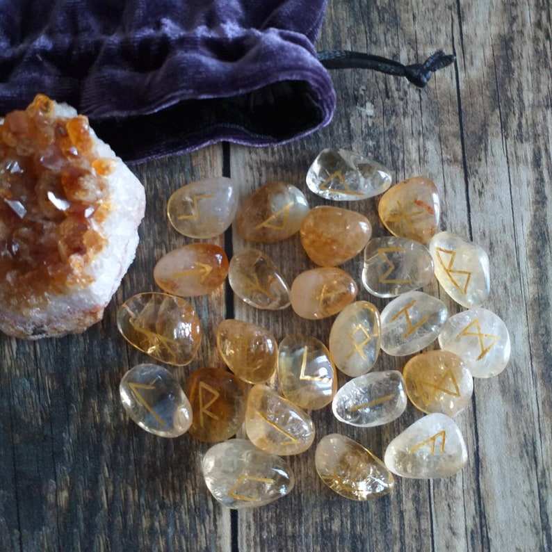ทำด้วยมือ25ชิ้นชุดหินซิทรินคริสตัล Rune Futhark แก่ผู้สูงอายุหินอัญมณีรักษาความสมดุลของเครื่องสลักอักษรฮวงจุ้ย