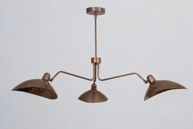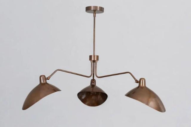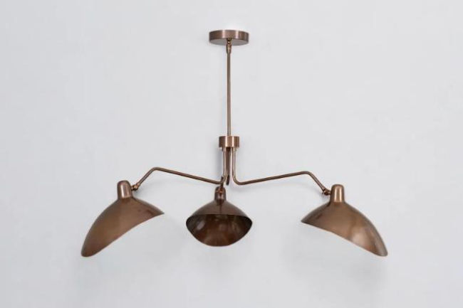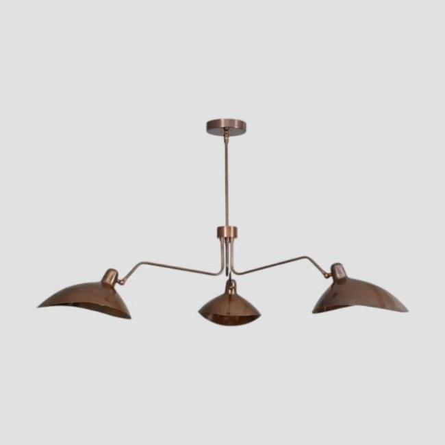 โคมไฟระย้า LED ทองเหลืองดิบ สไตล์มิดเซ็นจูรี่โมเดิร์น แขนโค้ง 3 ดวง ทำมือ รูปทรงสปุตนิก สำหรับบ้านและสำนักงาน