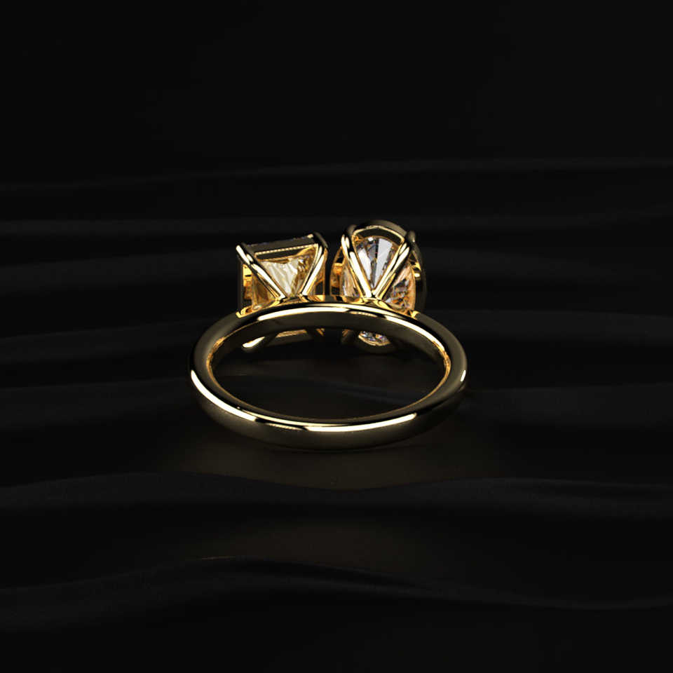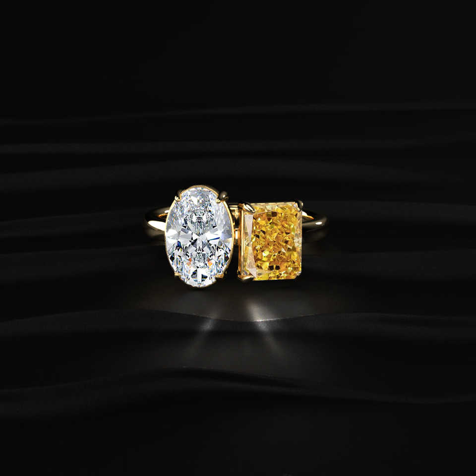 แหวนเพชรโมอิสซาไนต์ทรงรีสีเหลือง 5.45 กะรัต งานแฮนด์เมด สองเม็ด คุณภาพ VVS1 ทรงเจียระไนเยี่ยม 1.7 มม. ทอง 14K ผู้ผลิตเครื่องประดับชั้นดี