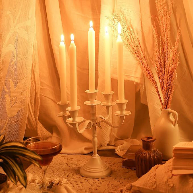 เชิงเทียนโลหะเคลือบด้วยผงสีขาว5แขนทำด้วยมือสำหรับงานแต่งงานบ้านและการตกแต่งโรงแรมหรูหราและทนทาน