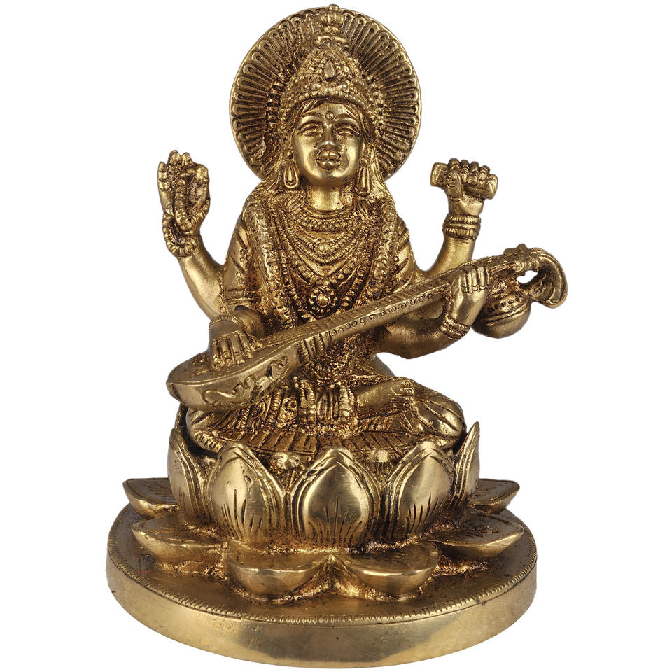 Handmade 5-Inch Brass Sculpture of Goddess Saraswati Four-Armed Seated on Lotus Made in India for Gift Giving