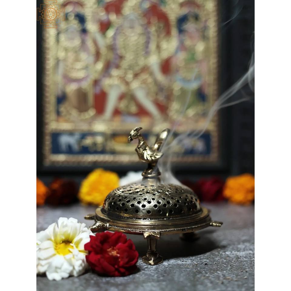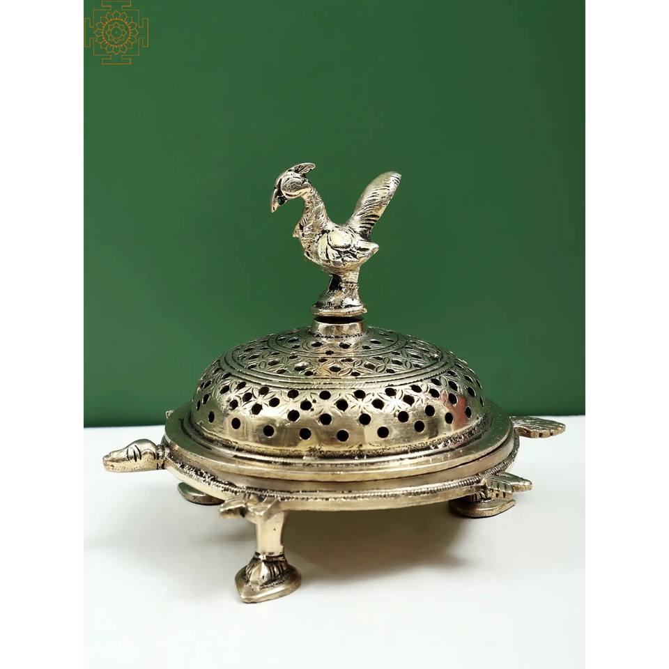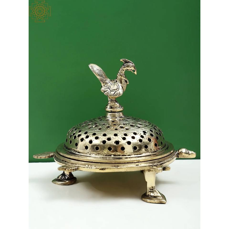 กระถางธูปทองเหลืองลายนกยูงขนาด6นิ้วทำด้วยมือพร้อมฐานธูปเต่าและที่วางเครื่องพ่นน้ำมันหอมระเหย