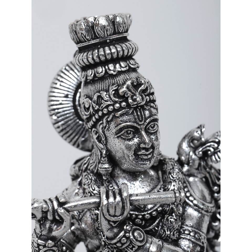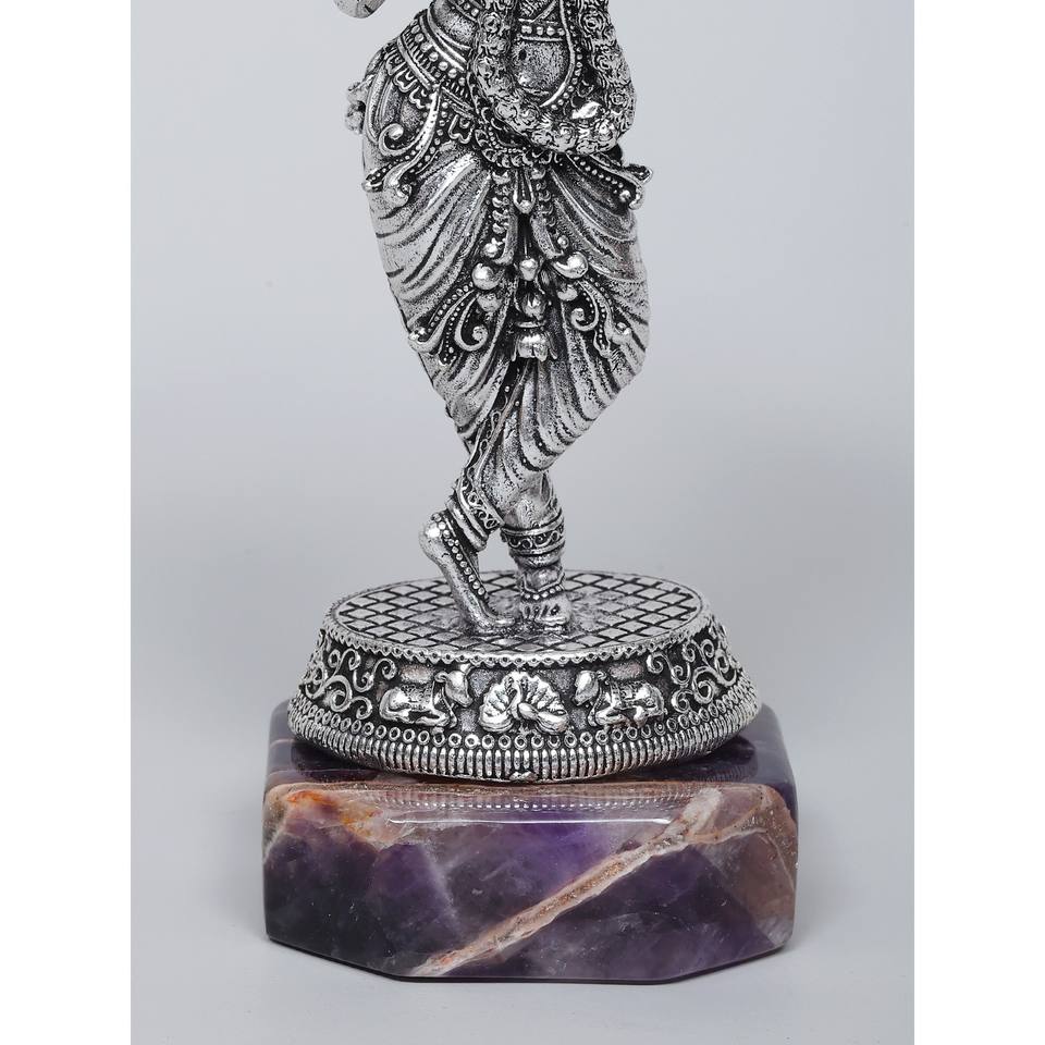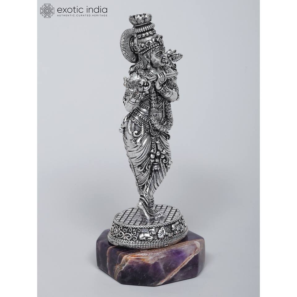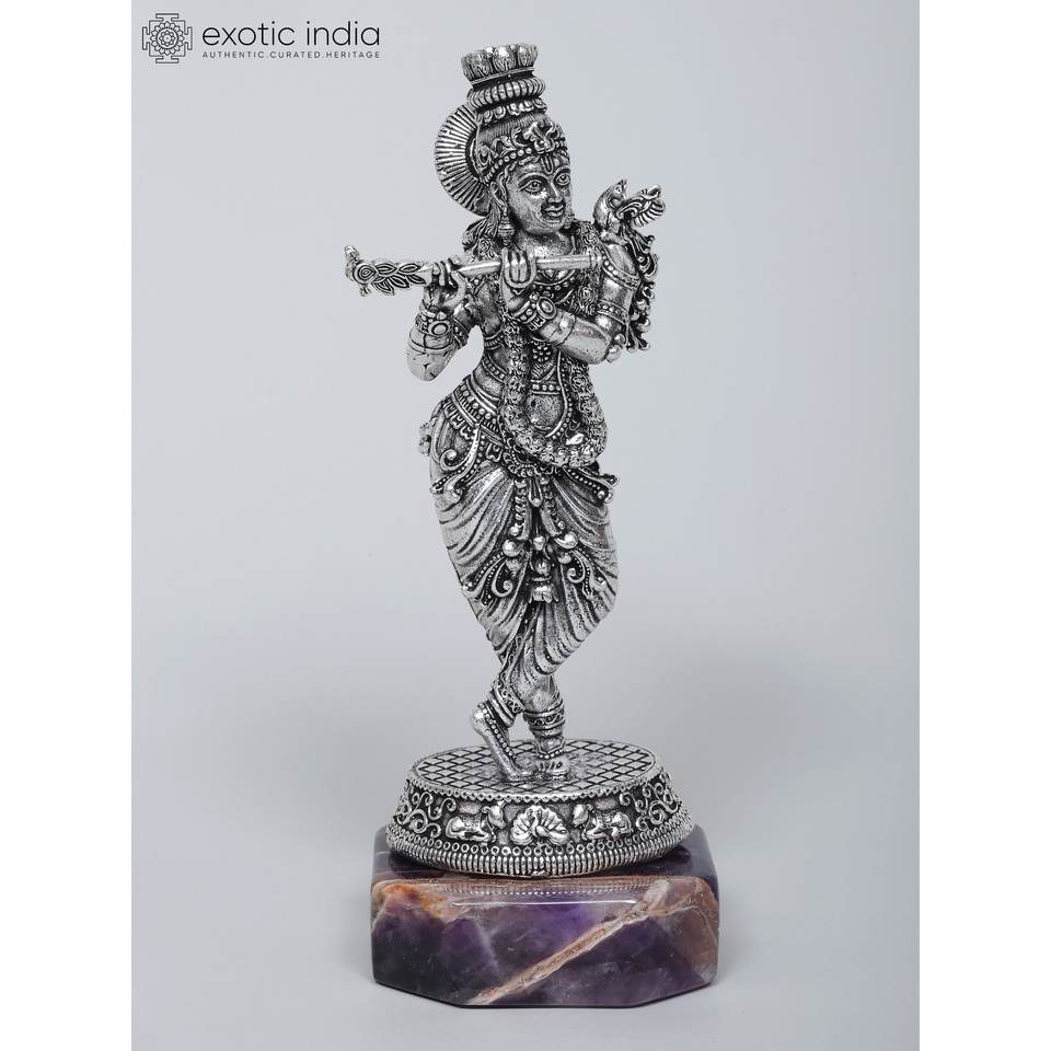 ทำด้วยมือ6 "รูปปั้นทองเหลืองขนาดเล็กของพระกฤษณะที่มีการสะบัดละเอียดมากบนฐานพลอยอเมทิสต์