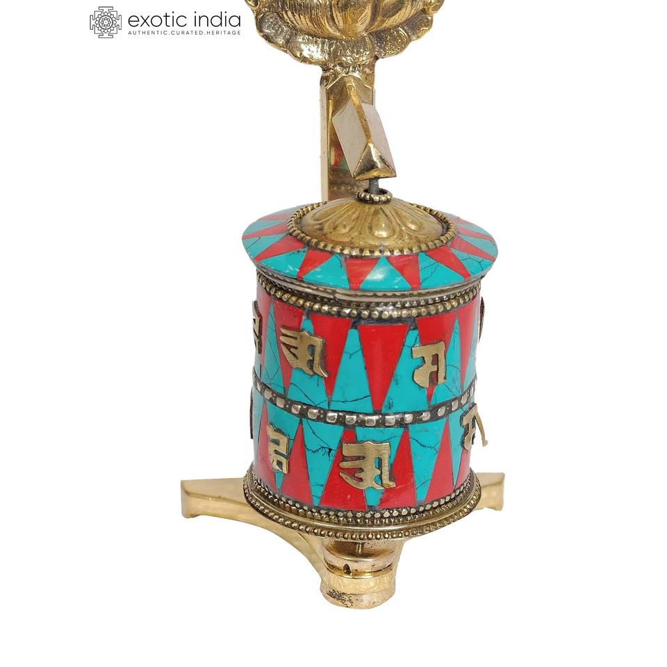 ล้ออธิษฐานของชาวพุทธทิเบตทำด้วยมือขนาด7นิ้วพร้อมแจกัน (ashtamangala) ของตกแต่งบ้านทำจากทองเหลืองจากอินเดียสำหรับเป็นของขวัญ