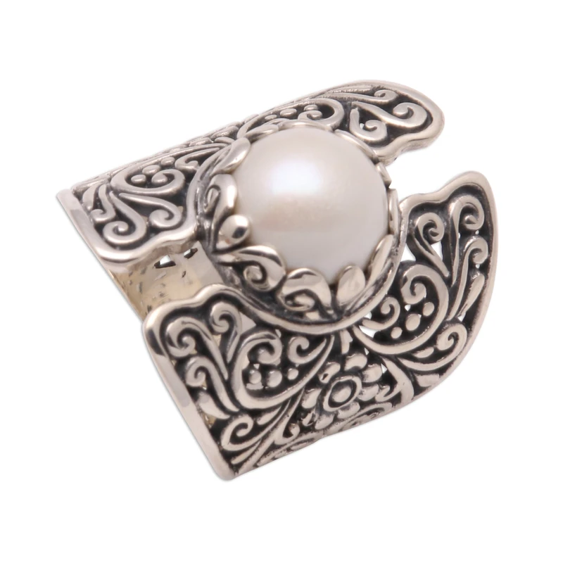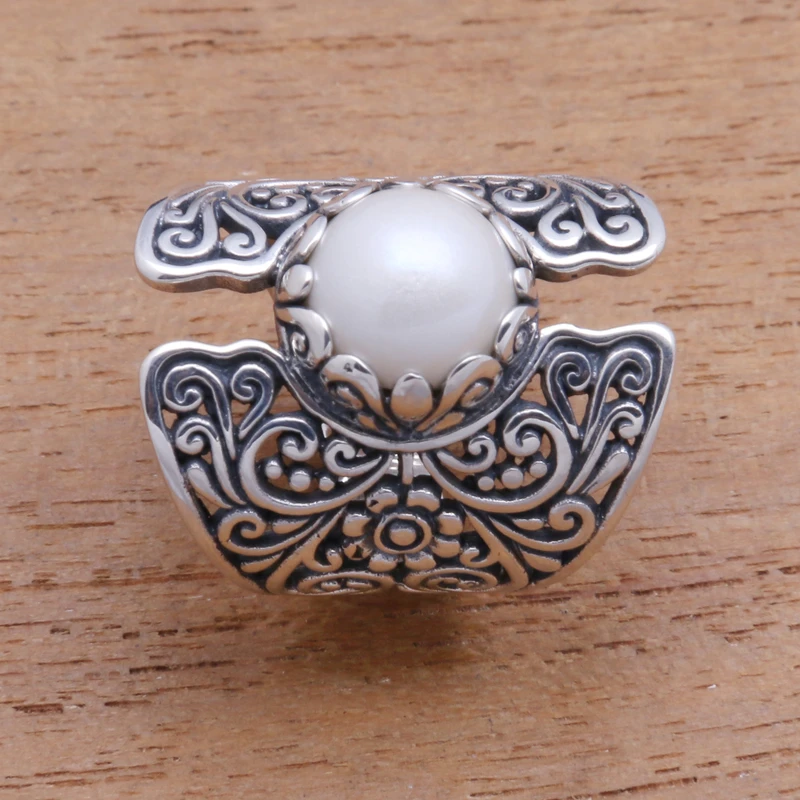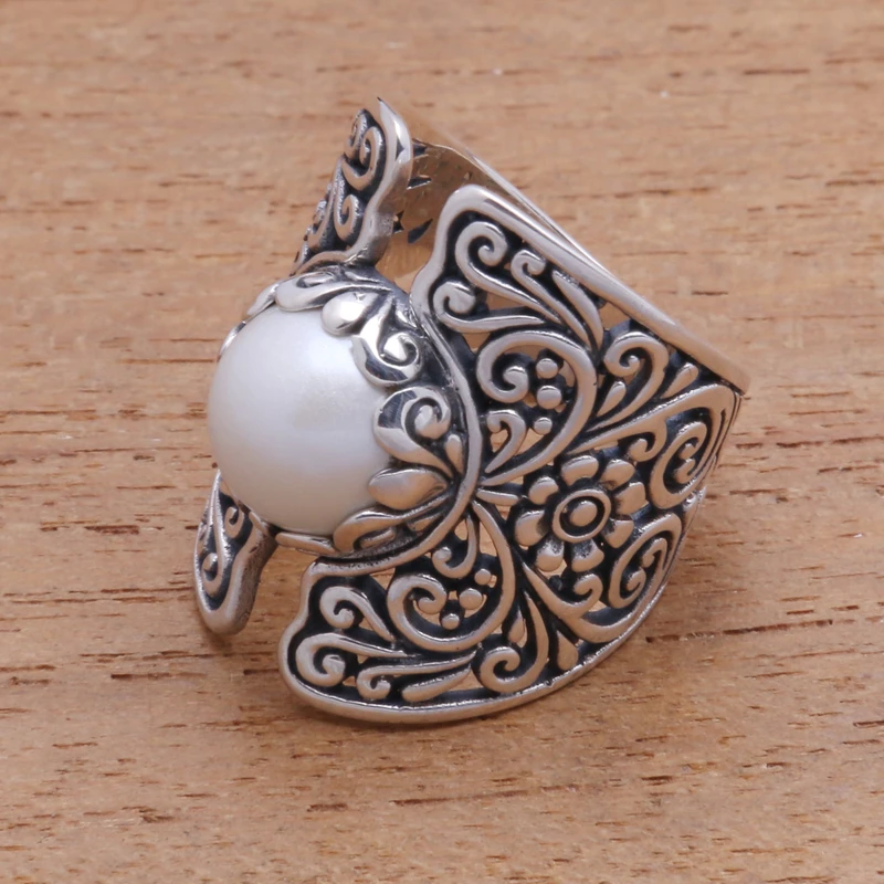 แหวนค็อกเทลสีเงิน925ทำด้วยมือสไตล์โบโฮพร้อมไข่มุกเลี้ยงสีขาวเหมาะสำหรับปาร์ตี้งานแต่งงานของขวัญคริสเตียนสำหรับเขา