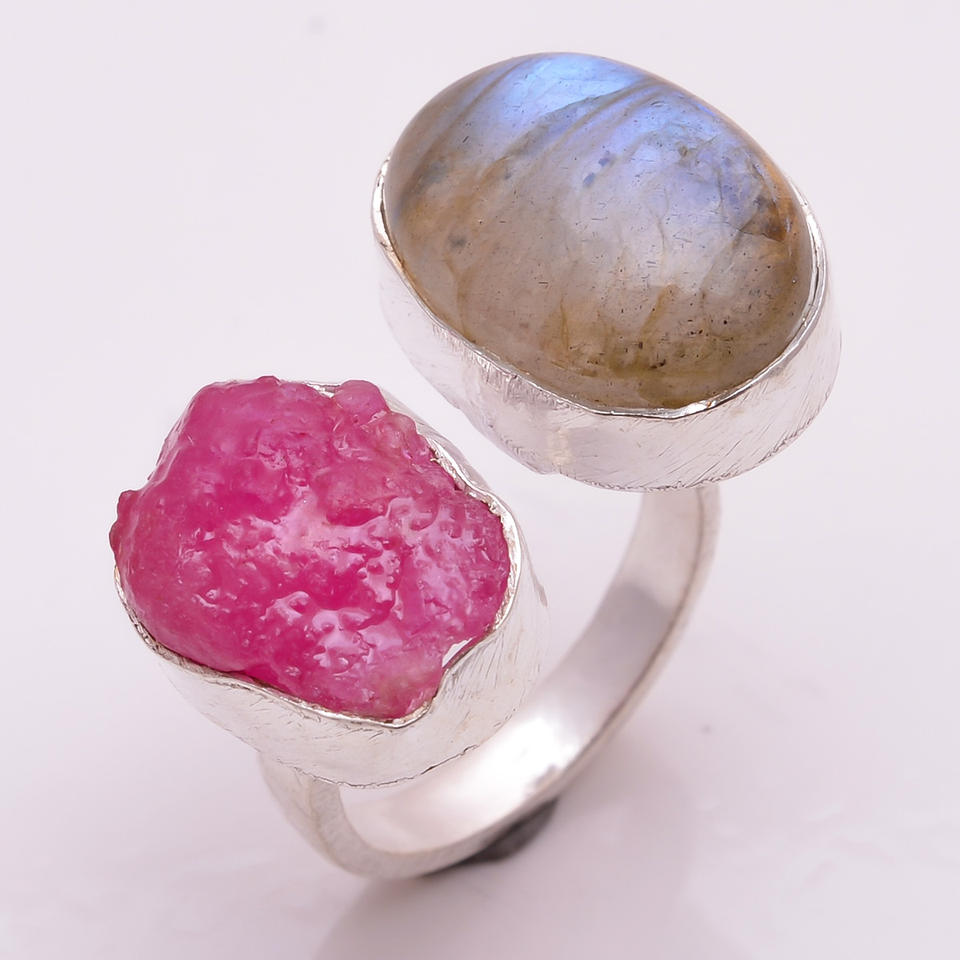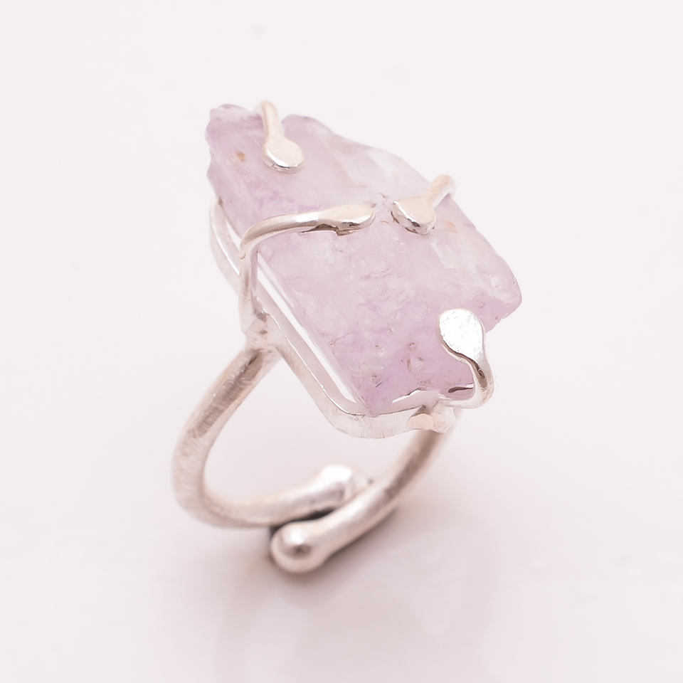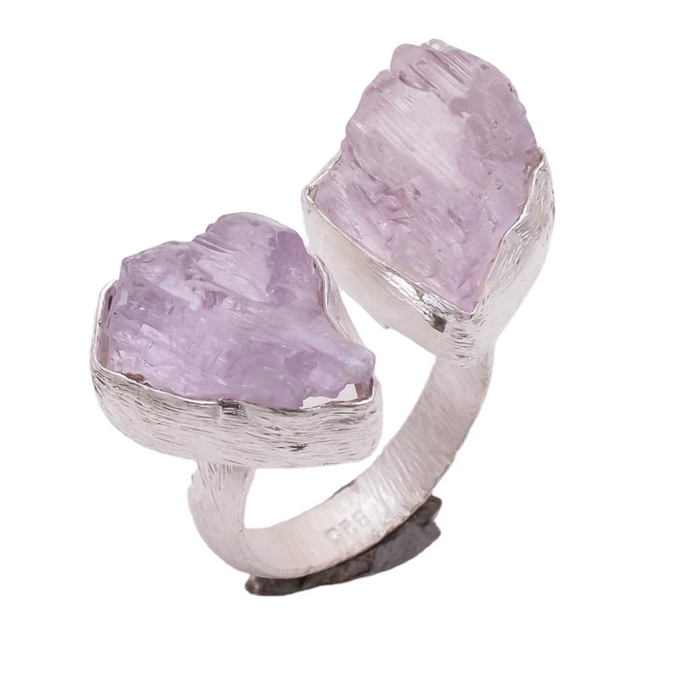 แหวนเงินแท้ทำด้วยมือ925พร้อมพลอย kunzite หยาบจากธรรมชาติผู้ส่งออกออกแบบได้ตามต้องการและผู้ผลิตเครื่องประดับอัญมณี