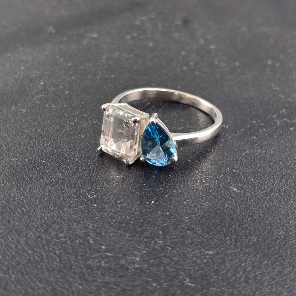 แหวนเงินทำด้วยมือ925ที่มีพลอยบุษราคัมสีขาวและสีน้ำเงินเครื่องประดับที่สง่างาม
