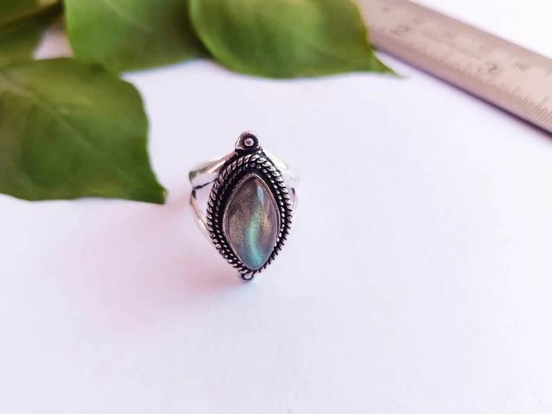 แหวนเงินแท้ 925 ประดับพลอยลาบราดอไรต์สีน้ำเงินธรรมชาติทรงมาร์คีส์ งานแฮนด์เมดสำหรับผู้หญิง