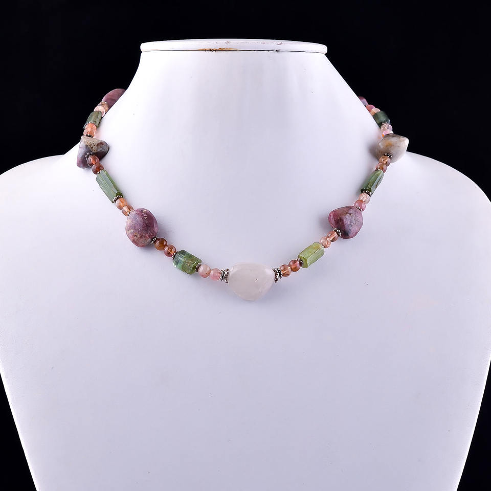 สร้อยคอเงินแท้ 925 ทำมือ ประดับด้วยพลอยทัวร์มาลีนธรรมชาติหลากสี ดีไซน์แบบเชื่อมต่อ สไตล์ชาติพันธุ์