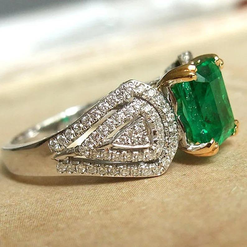 แหวนหมั้นเพชรสีเขียวมรกตทำด้วยมือทำจาก925เงินสเตอร์ลิงงานแต่งงานอินเดียย้อนยุคของผู้หญิง