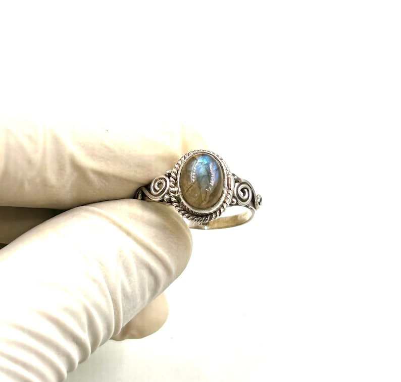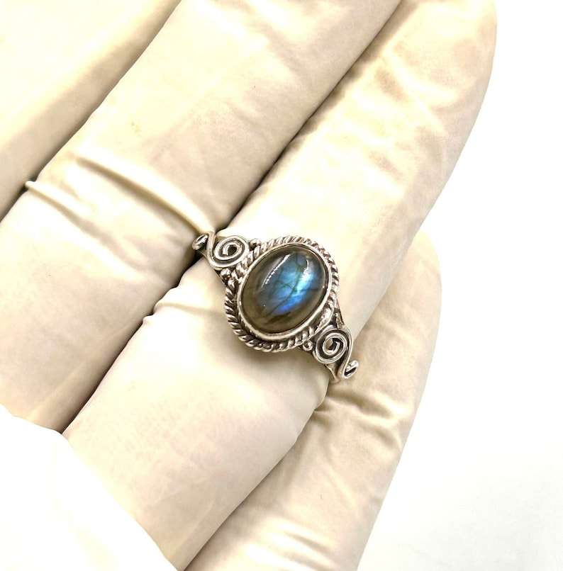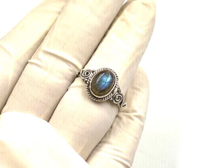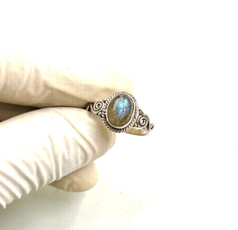 แหวนเงินแท้ 925 ทำมือ ประดับพลอยลาบราดอไรต์สีน้ำเงินไฟ ชุบโรเดียม ดีไซน์มินิมอล เครื่องประดับผู้หญิง ทำมือ