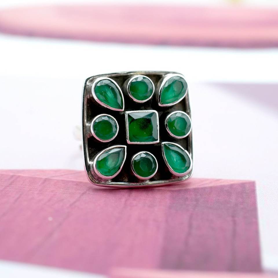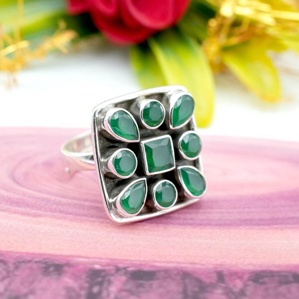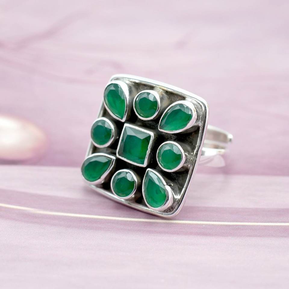 แหวนเงินสเตอร์ลิง925ทำด้วยมือพร้อมพลอยโอนิกซ์สีเขียวปรับได้ของขวัญสำหรับ R0054-GS ของเธอ