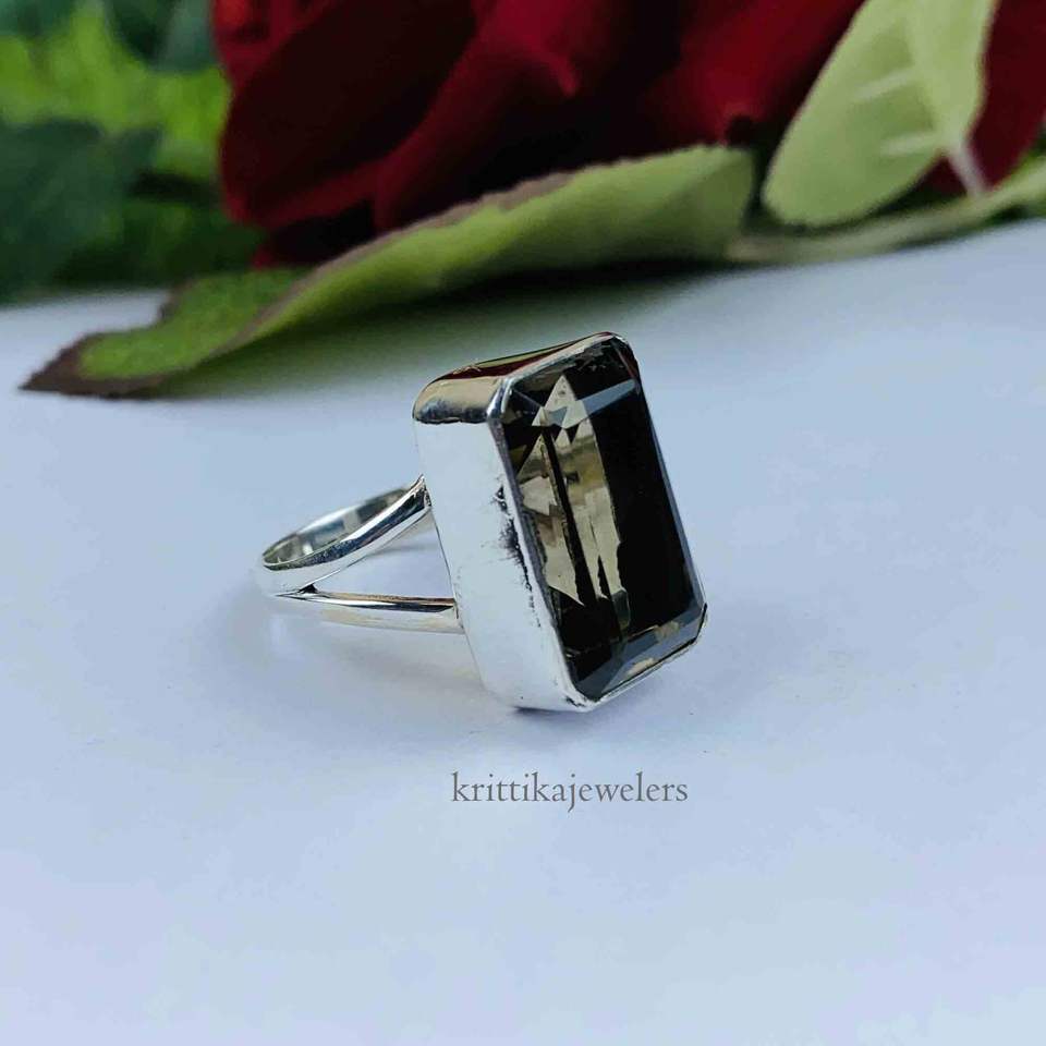 แหวนเงินสเตอร์ลิงทำด้วยมือ925อัญมณีควอตซ์สโมควอตซ์ธรรมชาติสำหรับผู้หญิงการตั้งค่าหนามเตยสำหรับงานแต่งงานแบบคลาสสิก