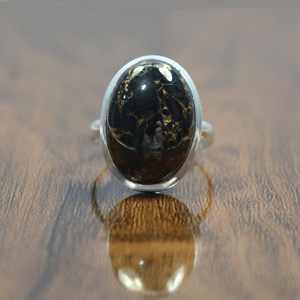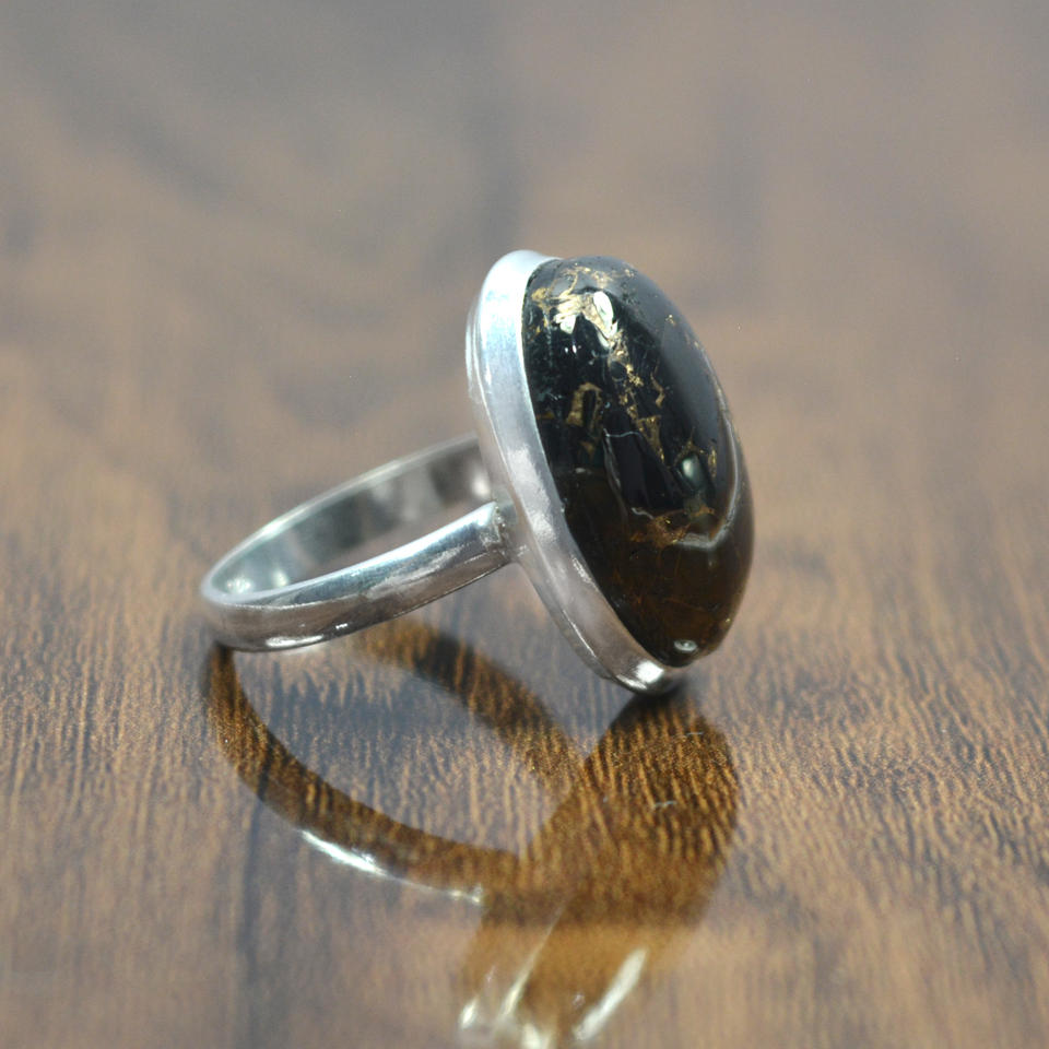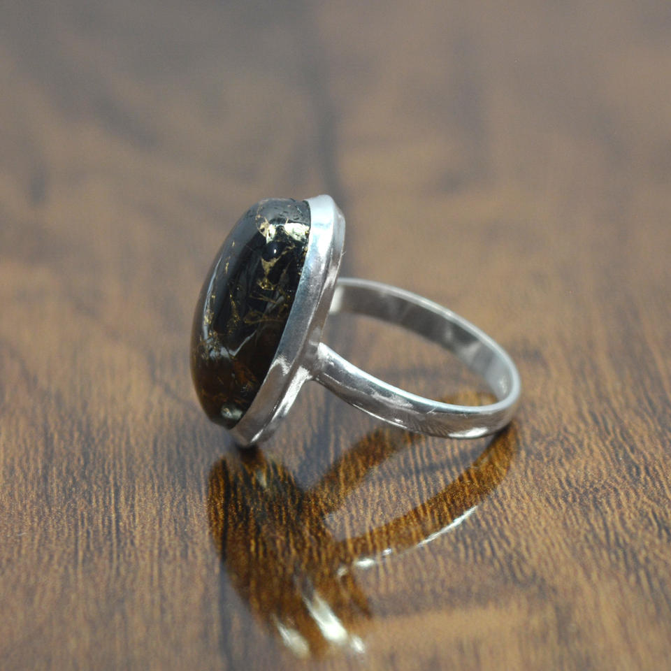 แหวนพลอย shungite สีเงินสเตอร์ลิงทำด้วยมือแหวนพลอยสีดำตัดรูปไข่925