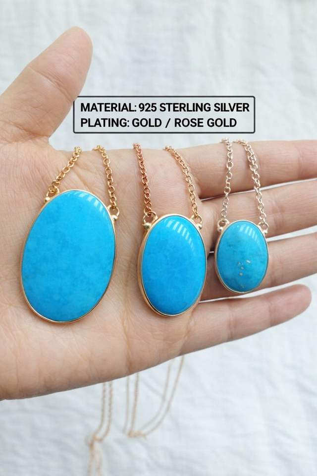 สร้อยคอเงินแท้ 925 รูปไข่ประดับเทอร์ควอยซ์ธรรมชาติ ดีไซน์ทันสมัย ทำด้วยมือ ชุบทอง ตัวเลือกโซ่ยาว 65 ซม. จี้ขนาด 5 ซม.