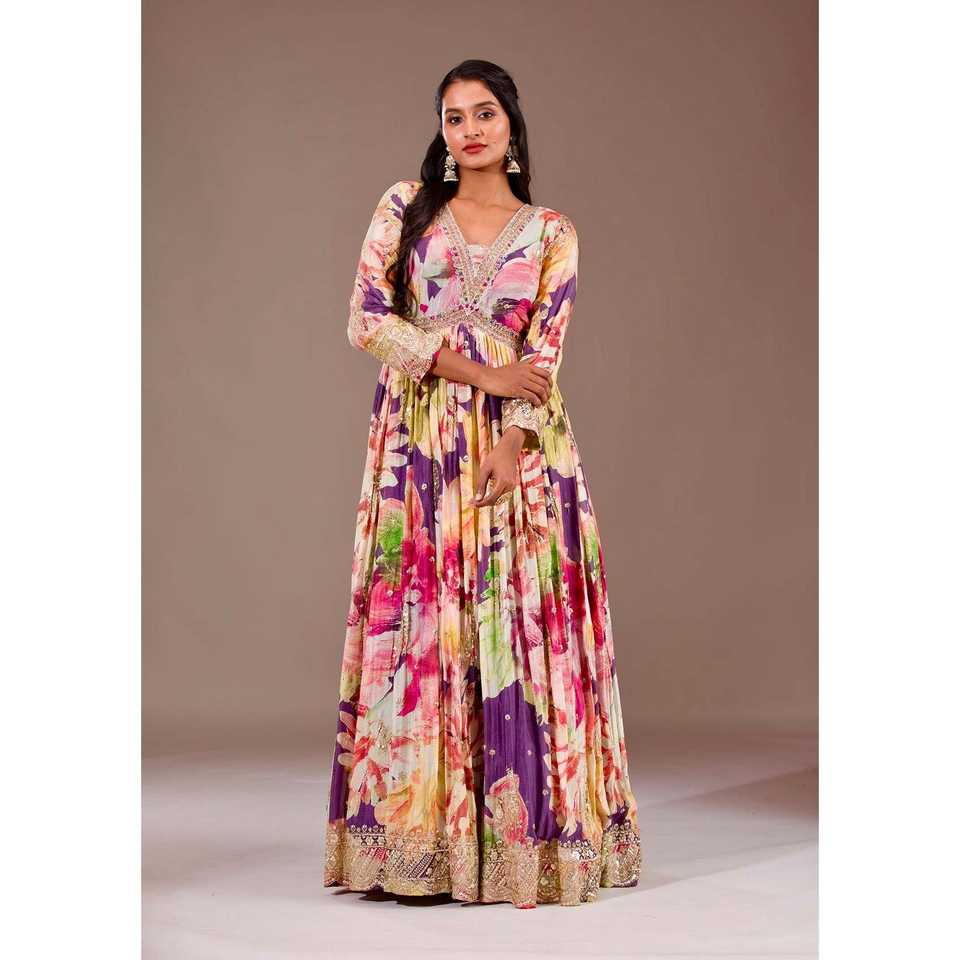 ชุดราตรีทรงเอไลน์งานแฮนด์เมด ตกแต่งด้วยด้ายปักและเลื่อมลายดอกไม้ ผ้าชีฟองทรงเอ็มไพร์