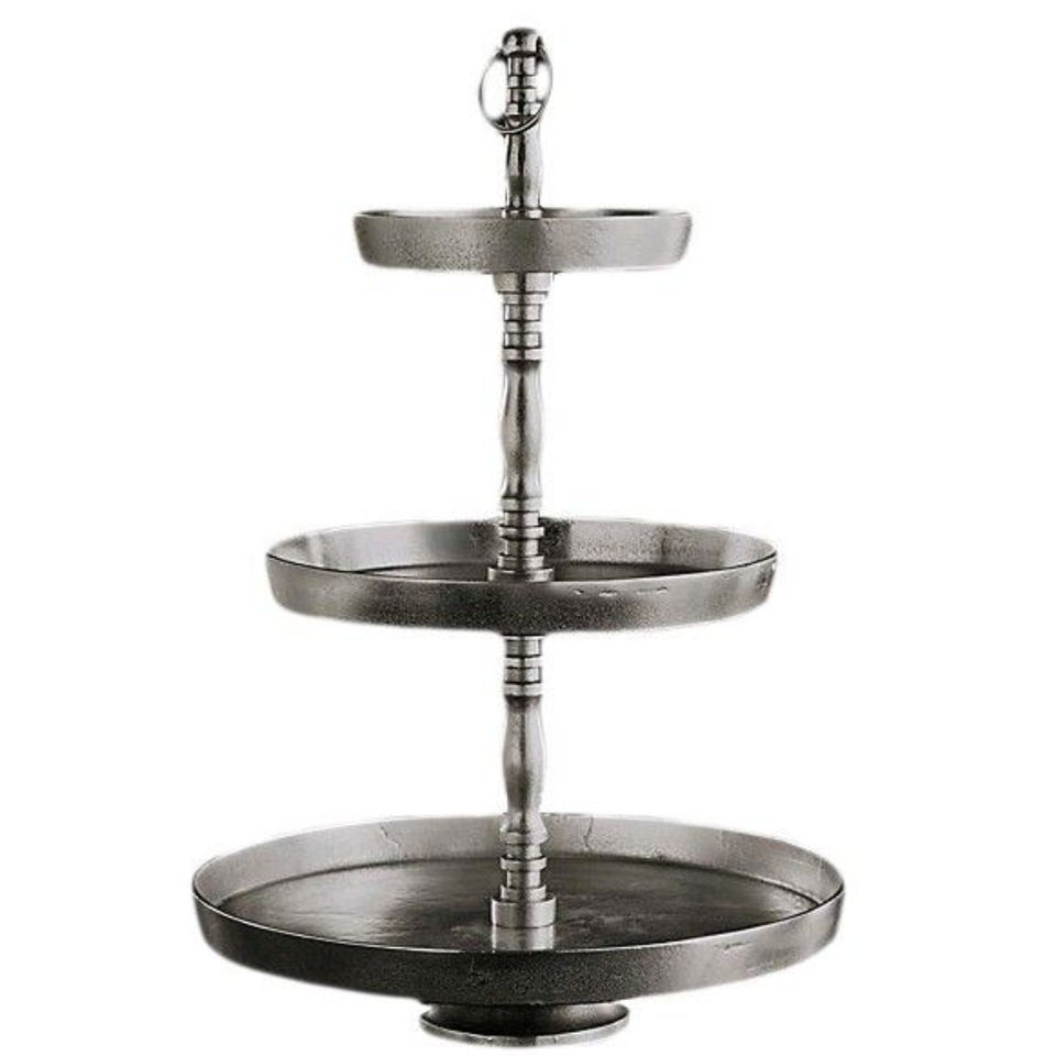 ชั้นวางคัพเค้กอะลูมิเนียมทำมือ 2 ชั้น ตกแต่งด้วยโลหะสีเงินทรงกลม พร้อมห่วงจับสำหรับเสิร์ฟขนมหวาน