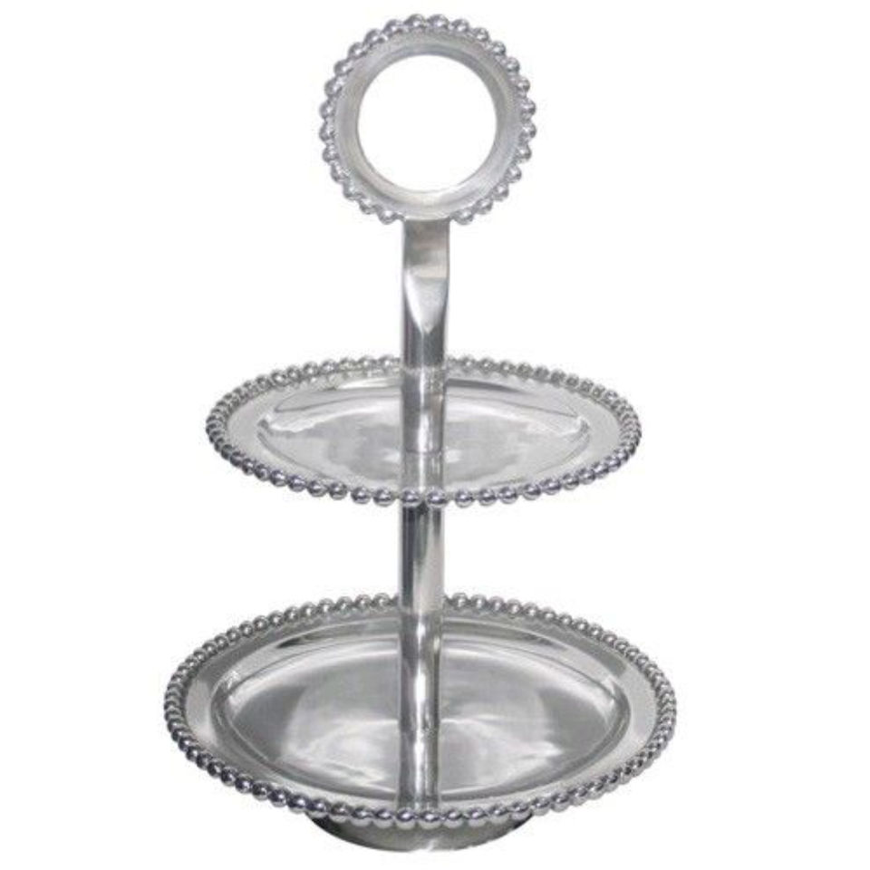 ชั้นวางคัพเค้กอะลูมิเนียมทำมือ 2 ชั้น ตกแต่งด้วยโลหะสีเงินทรงกลม พร้อมห่วงจับสำหรับเสิร์ฟขนมหวาน