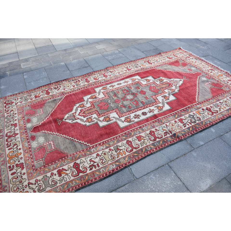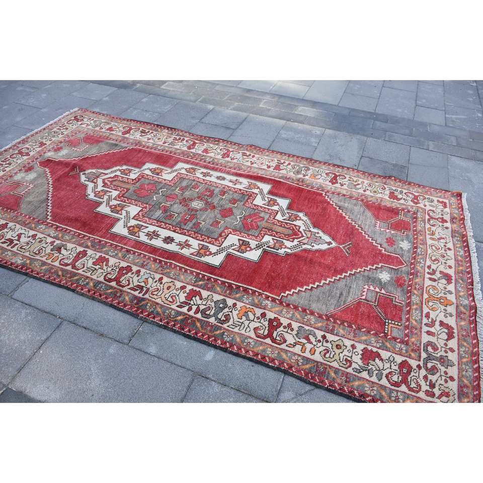 พรมขนสัตว์สีเบจอนาโตเลียทำด้วยมือ4.9x9.3ft สไตล์ตุรกีลายปะต่อสี่เหลี่ยมสำหรับห้องนั่งเล่นยางขนาด10มม.