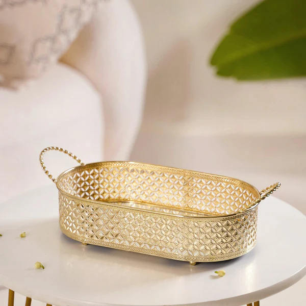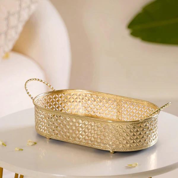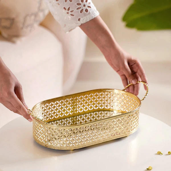 โต๊ะทองเหลืองโบราณทำด้วยมือถาดเสิร์ฟคุณภาพสูงน้ำหนักเบารูปทรงวงรีแฟนซีสำหรับเก็บจาน