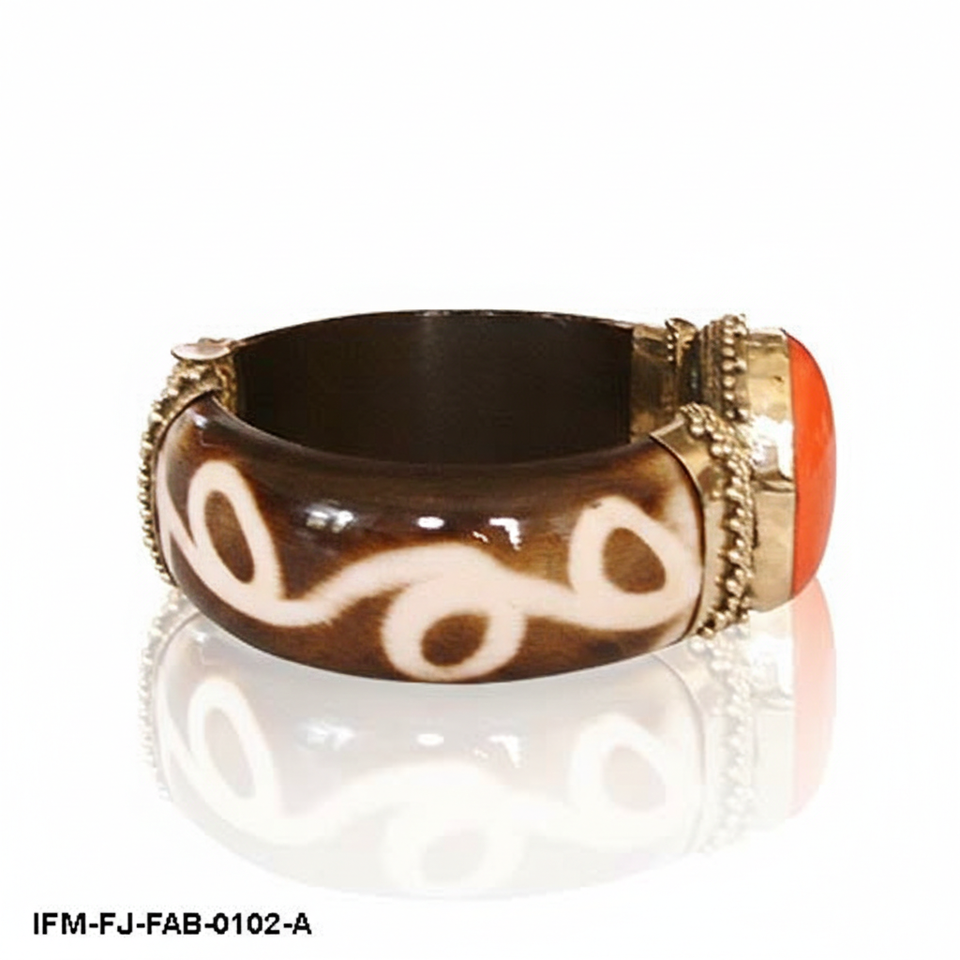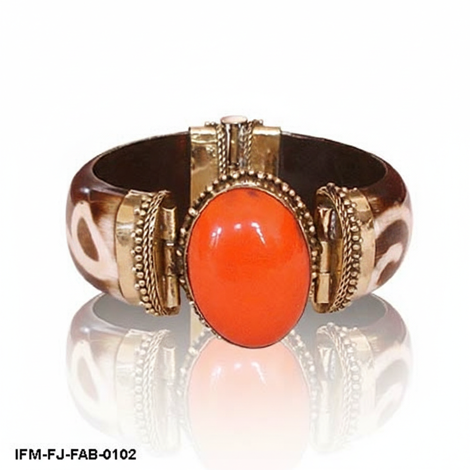Handmade Antique Gold Ethnic Cuff Bangle with Vibrant Orange Resin Stone and Tribal Bone Inlay Detail