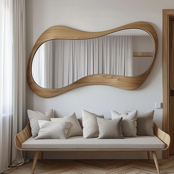 กระจกโต๊ะเครื่องแป้งสไตล์อาร์ตเดคโคทำด้วยมือเป็นมิตรกับสิ่งแวดล้อมน้ำหนักเบาไม่สมมาตรออกแบบไม่สมมาตรขอบขอบทำจากไม้วอลนัทแท้ใช้ในบ้าน