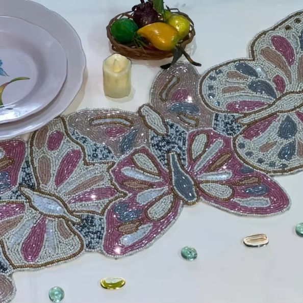 ผ้าปูโต๊ะลูกปัดผีเสื้อทำด้วยมืออุปกรณ์เสริมสำหรับโต๊ะอาหารปักลายหรูหราตกแต่งฤดูใบไม้ผลิ