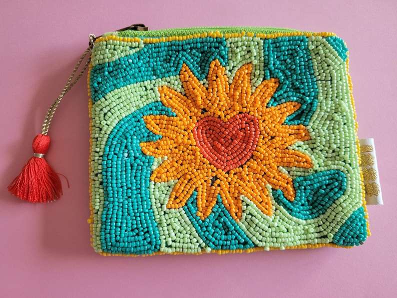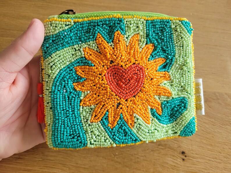 กระเป๋าใส่เหรียญประดับลูกปัดทำด้วยมือกระเป๋าใส่เหรียญรูปหัวใจดอกทานตะวันมีพู่ห้อยกระเป๋าสตางค์ลูกปัดสีสันสดใสกระเป๋าซิปสไตล์โบฮีเมียนฤดูร้อนของขวัญที่ไม่เหมือนใคร