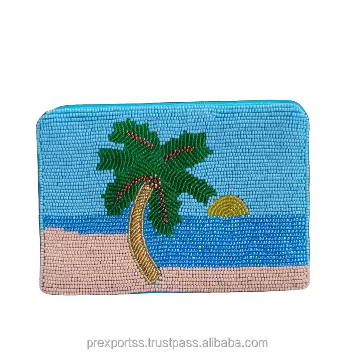 กระเป๋าใส่เหรียญแฟชั่นทำมือประดับลูกปัด นุ่ม ทนทาน ลายต้นปาล์มชายหาด ปักลายตามสั่ง ซิปแบบคลัทช์ ของขวัญสำหรับผู้หญิงและเด็กผู้หญิง