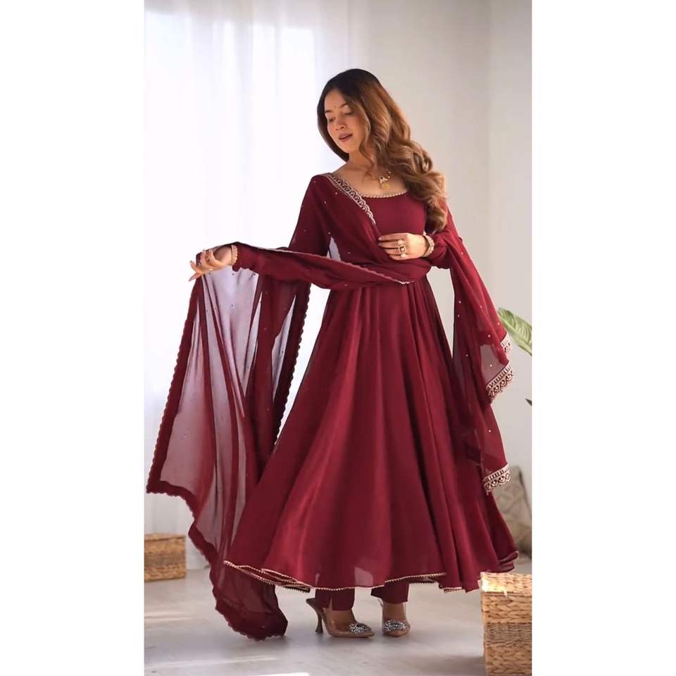 ชุดเดรสทรงเอไลน์สวยงามทำมือสำหรับงานปาร์ตี้ ประดับด้วยผ้าชีฟองดูปัตตาและพาลลู พร้อมดีไซน์เอวทรงเอ็มไพร์