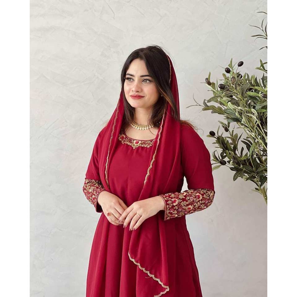 Handmade Beautiful Anarkali Gown with Floral Print Chiffon Bottom & Dupatta XL Size Empire Waistline Party Wear Look