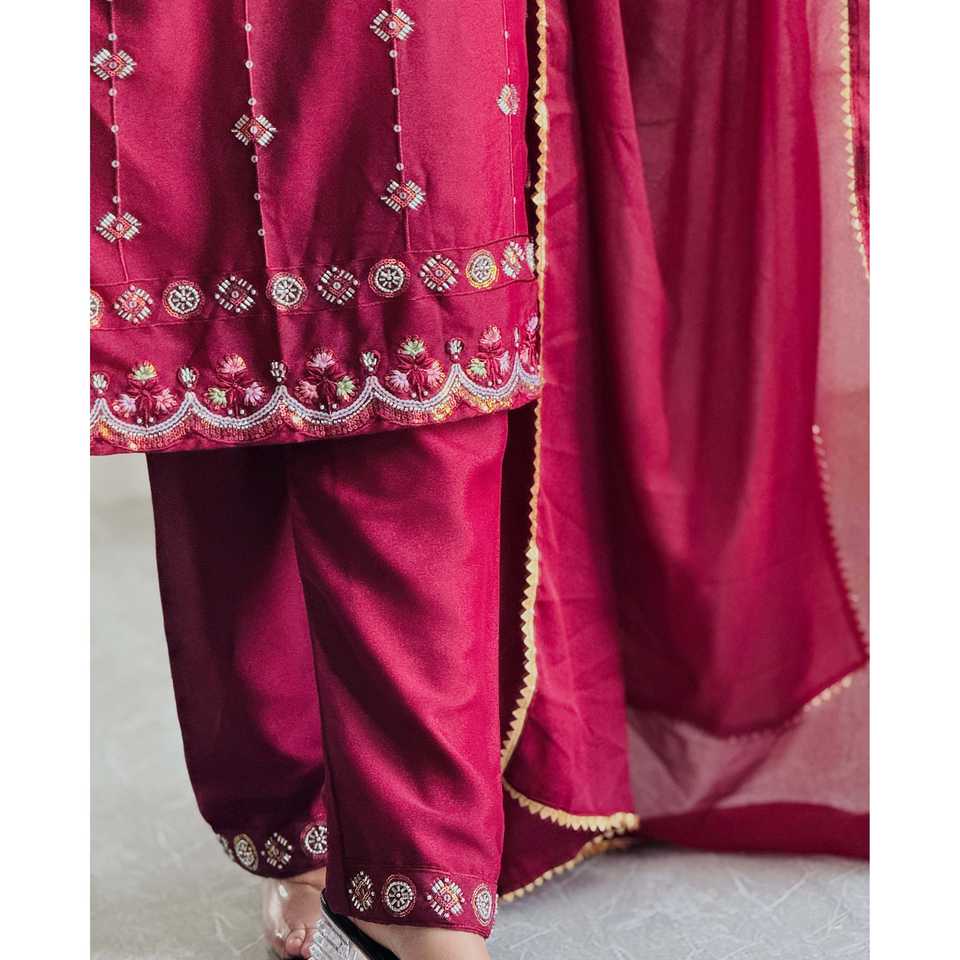 ชุดเสื้อผ้าชีฟองงานฝีมือสวยงามสำหรับงานปาร์ตี้ ประกอบด้วยเสื้อ กางเกง และผ้าคลุมไหล่ ทรงเอวธรรมชาติ