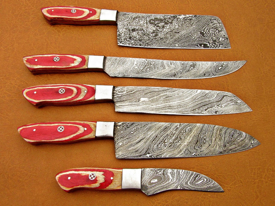 ชุดมีดทำครัวเหล็กดามัสกัสที่สวยงามทำด้วยมือพร้อมหมอนข้างสแตนเลสทำจากไม้ปาคคารวมถึงกระเป๋าถือหนัง