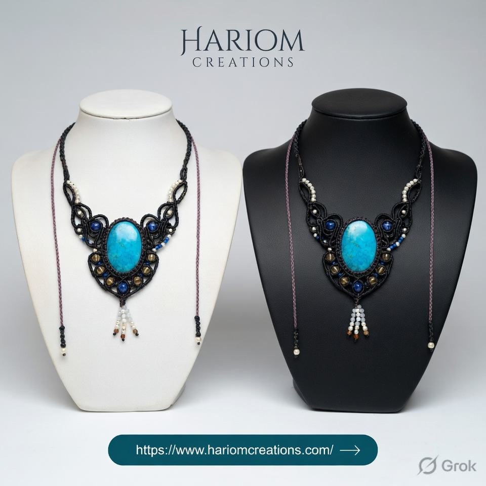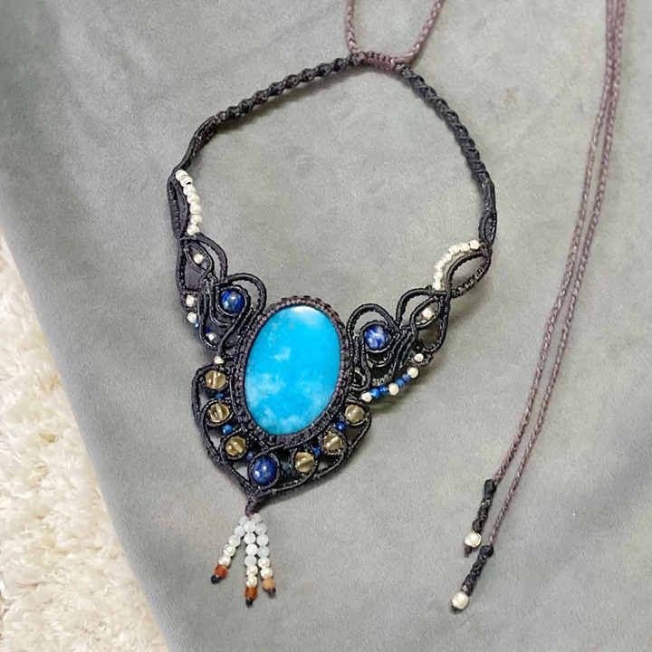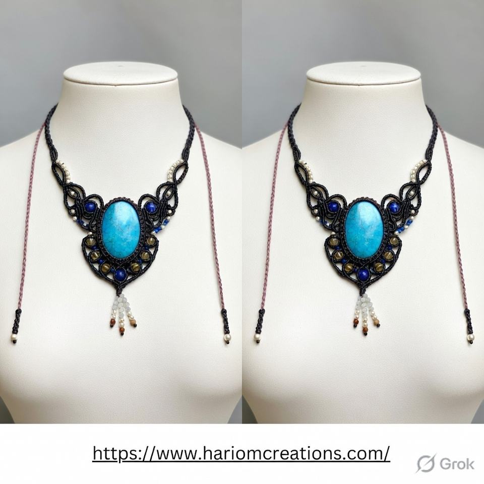 สร้อยคอทำมือสไตล์มาคราเม่สีดำ พร้อมจี้หินเทอร์ควอยซ์สีน้ำเงินธรรมชาติ สไตล์โบโฮ ปรับความยาวได้ เหมาะสำหรับผู้หญิง เป็นเครื่องประดับที่โดดเด่น