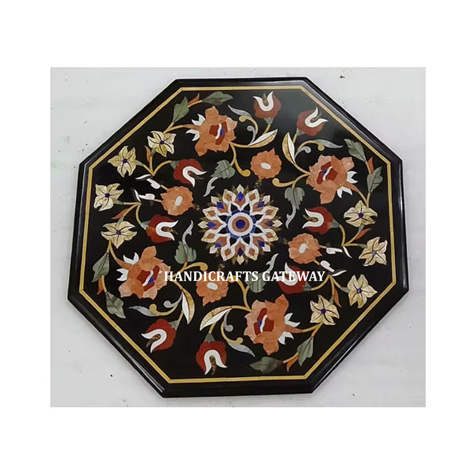 หินอ่อนสีดำทำด้วยมือโต๊ะฝังดอกไม้ทรงแปดเหลี่ยมพื้นผิวเรียบและมันวาวใช้สำหรับโต๊ะกาแฟกลางแจ้ง