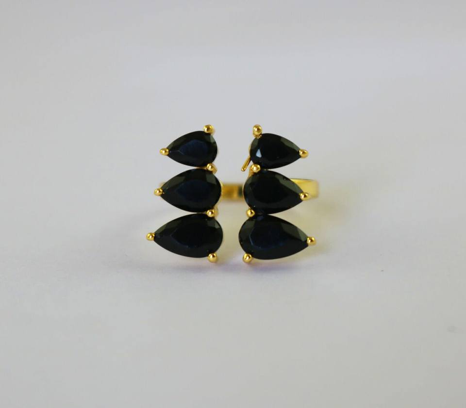 แหวนพลอยออนิกซ์ดำทำมือ ชุบทอง 14k บนทองเหลือง แหวนปรับขนาดได้สำหรับผู้หญิง
