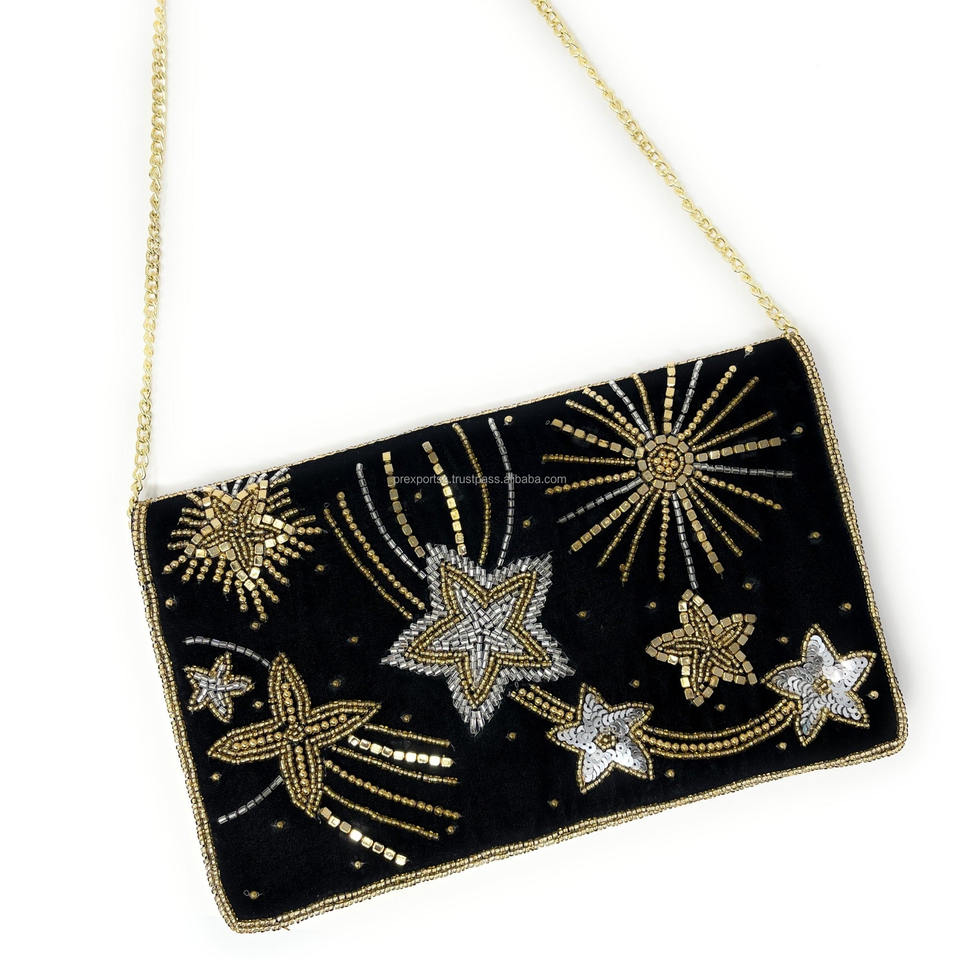 กระเป๋าคลัทช์ประดับลูกปัดดาวกระจายสีดำทำด้วยมือสีทองเงินเลื่อมกระเป๋าเงินพับได้สำหรับออกงานปาร์ตี้ของขวัญเจ้าสาวกระเป๋าสายโซ่ที่ทนทาน