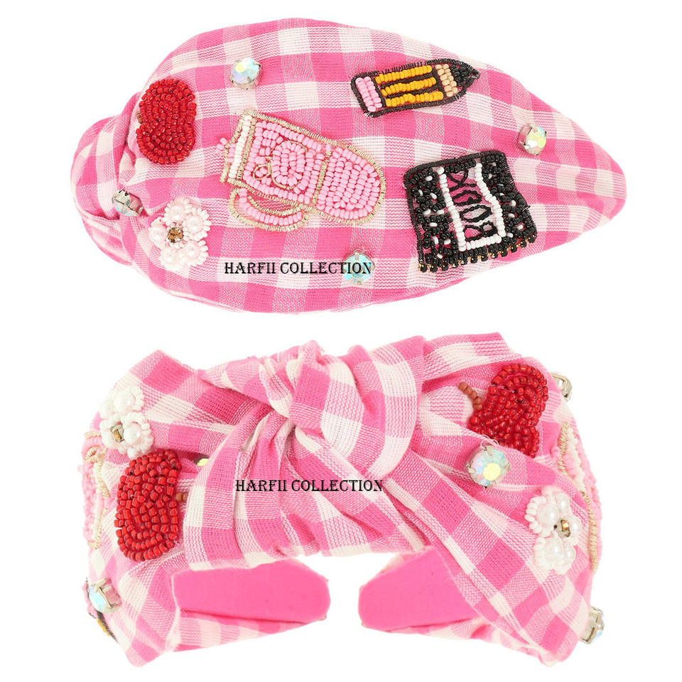 ที่คาดผมลายตารางขาวดำทำมือ ประดับลูกปัดลายดอกไม้สีน้ำตาล พร้อมจุกผูกผม สำหรับผู้หญิง เครื่องประดับผมสุดเก๋