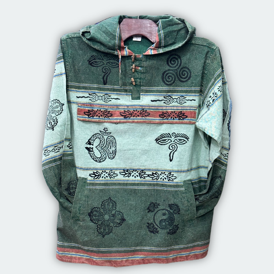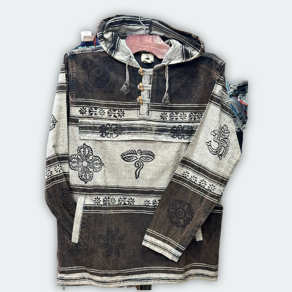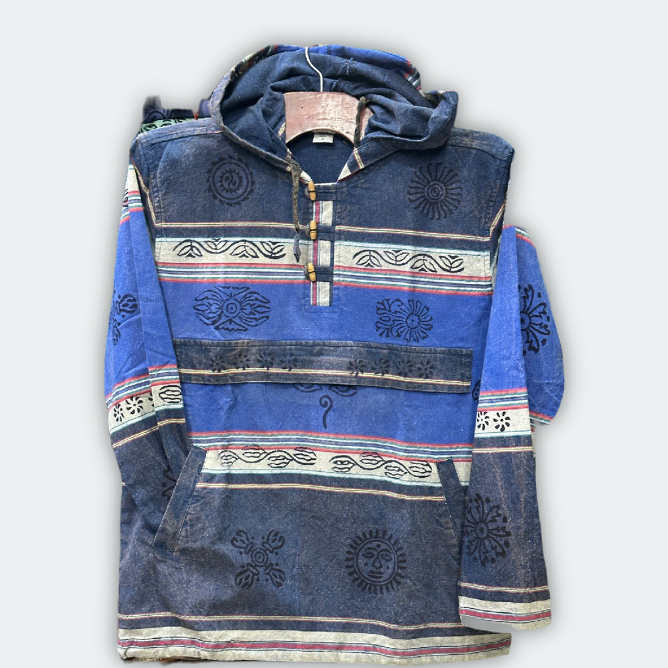 เสื้อฮู้ดดี้ผ้าฝ้ายพิมพ์ลายบล็อกทำมือ พร้อมซับในขนแกะลายสี่เหลี่ยม ใช้ได้ทั้งฤดูหนาว/ฤดูร้อน ผลิตในเนปาล