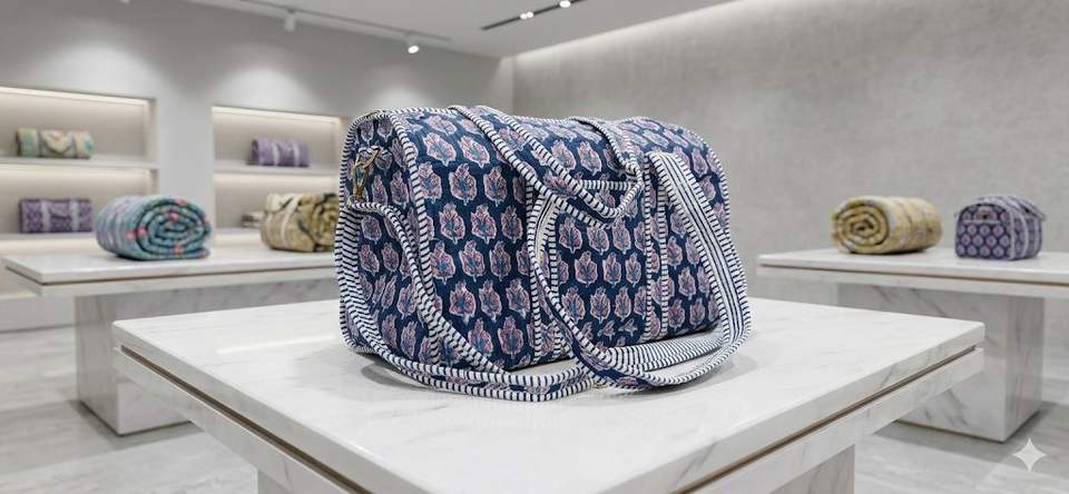 กระเป๋าเดินทางแบบดัฟเฟิลลายดอกไม้สีน้ำเงินทำมือจากผ้าฝ้าย ทนทาน เป็นมิตรกับสิ่งแวดล้อม หรูหรา เหมาะสำหรับกีฬาและการเดินทาง ขนาดใหญ่ จุของได้เยอะ มีซิป