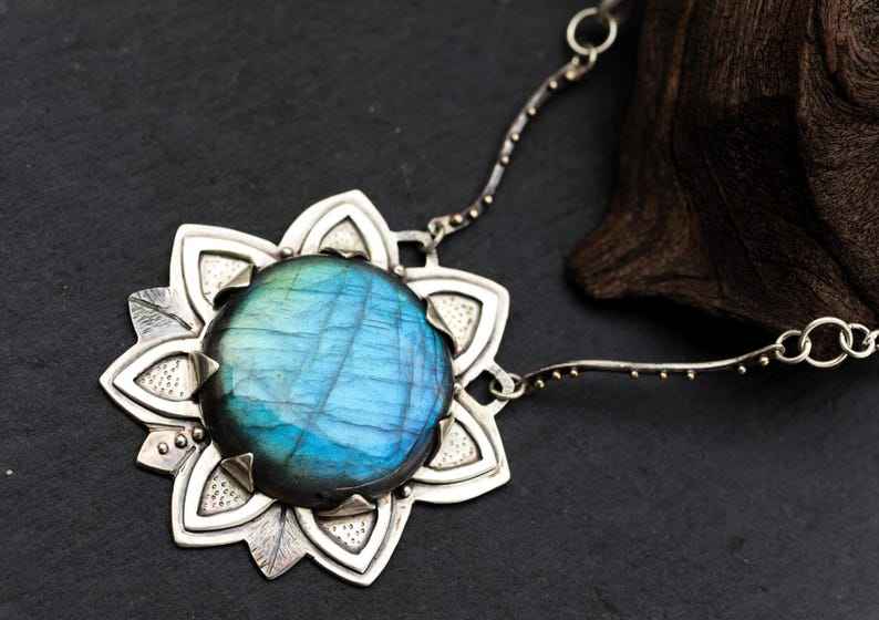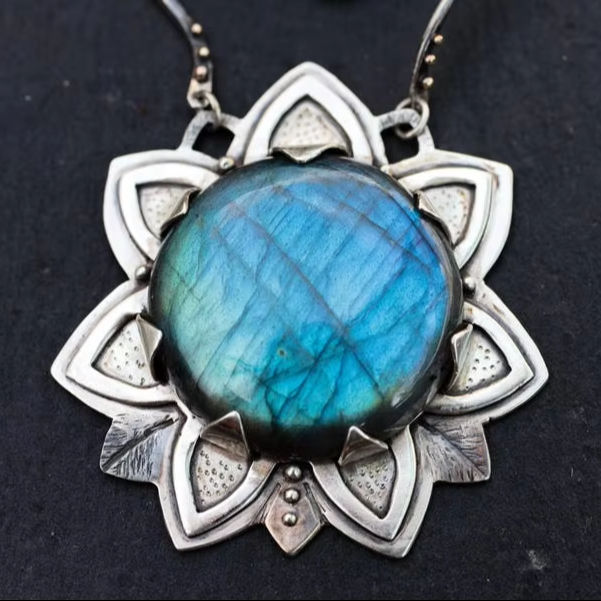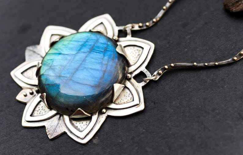 สร้อยคอจี้ลาบราดอไรต์สีน้ำเงินทำด้วยมือเงินสเตอร์ลิงประดับดอกบัวของขวัญที่ไม่เหมือนใครสำหรับภรรยาในโอกาสพิเศษ