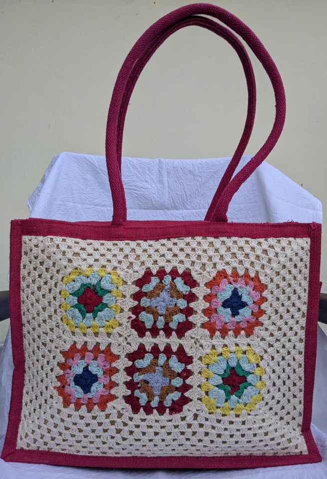 กระเป๋าช้อปปิ้งทำมือสีฟ้าและหลายคอลอร์เชือกทอเทปด้านบนซิปเปิดผ้าฝ้ายแท้สีแดงพร้อมถุงใส่ของขวัญซับในปอกระเจา