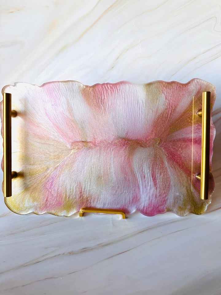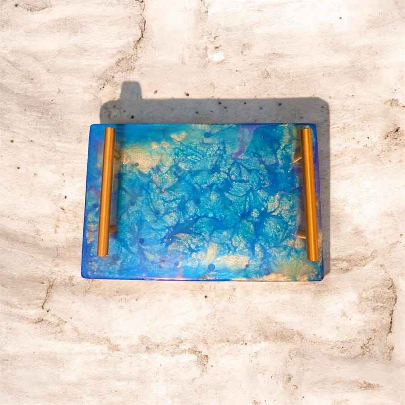 ถาดเสิร์ฟเรซิ่นสีน้ำเงินทำมือ ดีไซน์ลายเพ้นท์สีโรสโกลด์ พร้อมหูจับ งานฝีมือเหนือกาลเวลา ขนาดสั่งทำได้