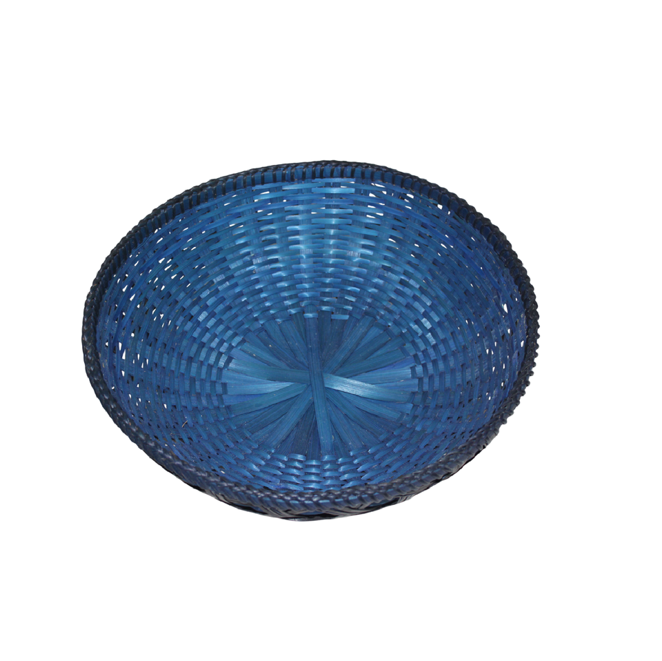 ตะกร้าไม้ไผ่ทรงกลมสีฟ้าแฮนด์เมดตะกร้าทอจากเวียดนามสำหรับตกแต่งผลไม้ดิสเพลย์ขนมปังที่ให้บริการบนโต๊ะ